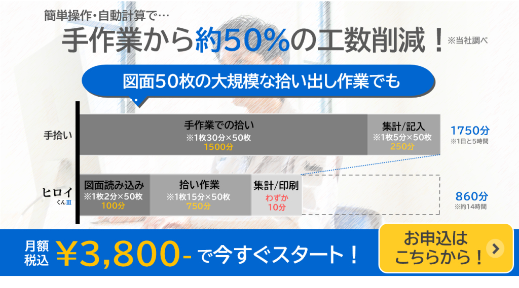 1. 作業時間を最大50%削減従来1〜2日かかっていた拾い出し作業が半日で完了。浮いた時間で別案件の見積作成が可能になり、受注機会が拡大します。
